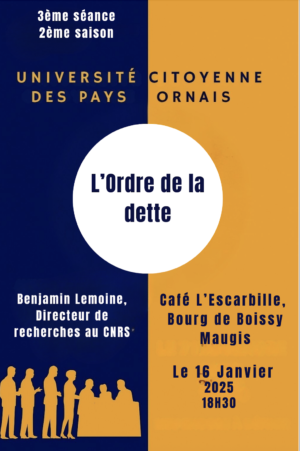 L'escarbille 5, rue du perche, Cour-Maugis sur Huisne, FrancePour la troisième séance de la deuxième saison de l’Université citoyenne des pays ornais, nous accueillerons Benjamin Lemoine, directeur de recherches au CNRS et grand spécialiste de la question de la dette publique. La séance aura lieu à l’Escarbille, bar associatif, qui nous reçoit pour l’occasion. Elle permet ainsi de faire vivre en commun sur […]