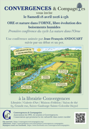 Samedi 18 avril, à 15h  : Librairie Convergences organisé par Convergences & Compagnies. ORE et nature dans l’ORNE, libre évolution des boisements humides animée par Jean-François ANDOUART. Cette conférence est la première du cycle que Convergences & Cie consacre à la nature dans l’Orne. Jean-François Andouart nous racontera l’aventure de la création de l’ORE (Obligation […]
